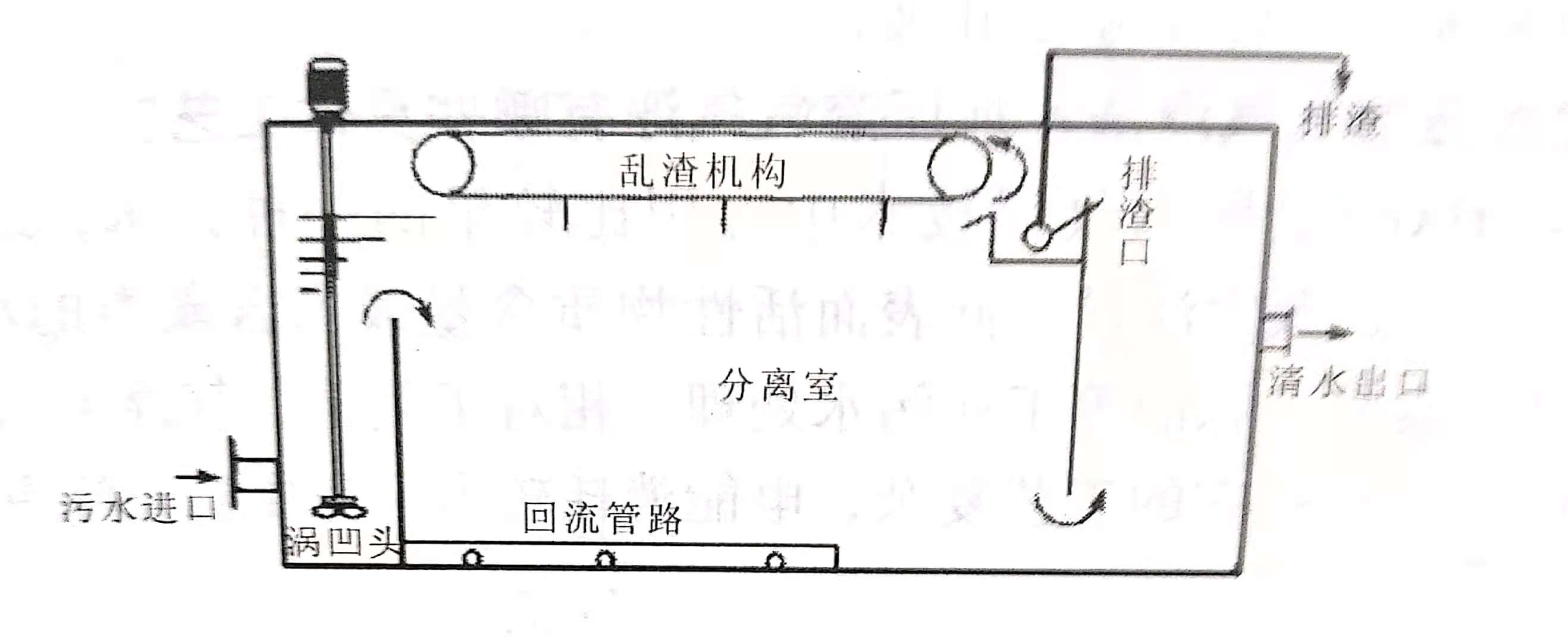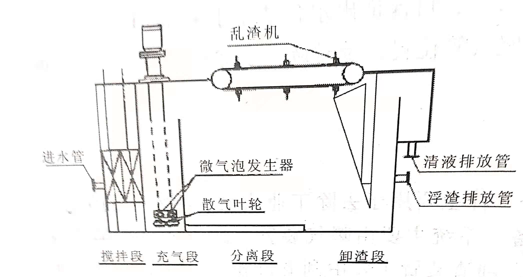 旋切式气浮属于引气扩散气浮,它与溶气气浮、喷射引气气浮、多级扩散气浮及电解气浮机理相同,因而同样具有广泛的应用前景。其最大的优点是形成的气泡直径与溶气气泡直径相近,但其能耗却小得多,而且不需要空压机、溶气罐、减压释放器等设施,占地面积小,基建投资也不大。旋切式气浮机如下图所示。