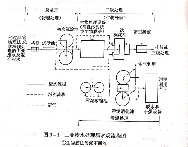 为达到国家污水排放标准,一般的废水处理场都采用一级处理(物理法或化学法)、二级生物法处理的处理流程(见图9-1),为避免工业废水水质不均衡引起对出水水质的影响,在二级生物法处理前后分别设置均质调节池(事故池)和监测池。